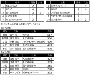 正会員企業より男性34名、⼥性13名が参加し、恒例のボーリング⼤会が開催されました。 腕に覚えのある⼈から初⼼者まで和気あいあいの雰囲気の中で楽しいひとときを過ごしました。 3ゲームトータルスコアで⾏われた競技の結果と参加者は下記のとおりです。