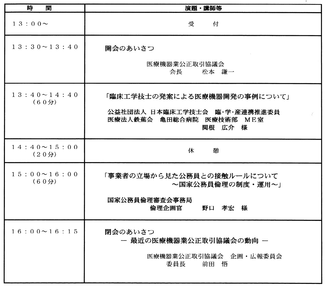 | 医療機器業公正取引協議会 第19回経営トップセミナー 平成30年2⽉15⽇(⽔)13:30-16:15 グランドアーク半蔵⾨ 4F「富⼠東の間」 | |